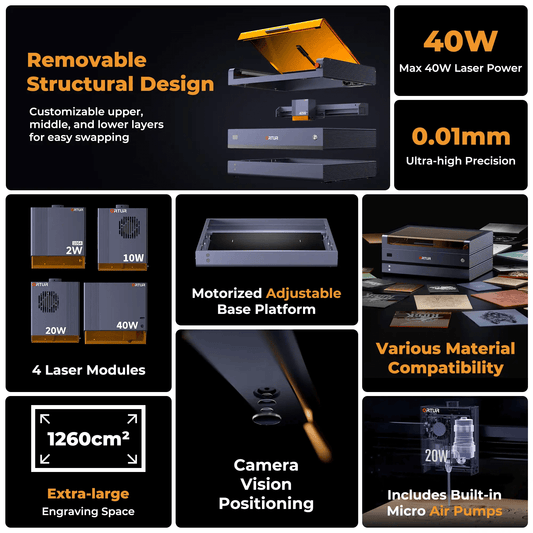 - 20W–40W: Adequado para cortar materiais mais espessos e gravar a maior velocidade ou profundidade.
